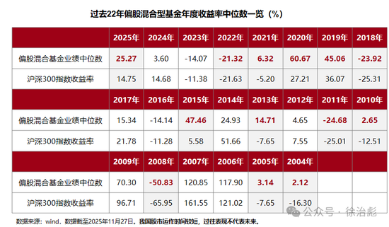 可以看下过去22年的公募基金中位数,你会很惊讶,并不是我是公募基金经理我要为自己说话,22年只有6年是亏钱,只占了不到30%年份比例,而且牛的年份是长阳,熊的年份是短熊。